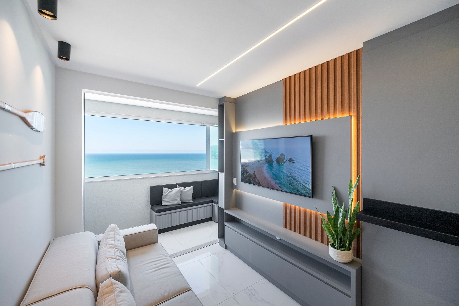 • Sacada com churrasqueira e vista total para o mar — um cenário que vai ficar na memória;