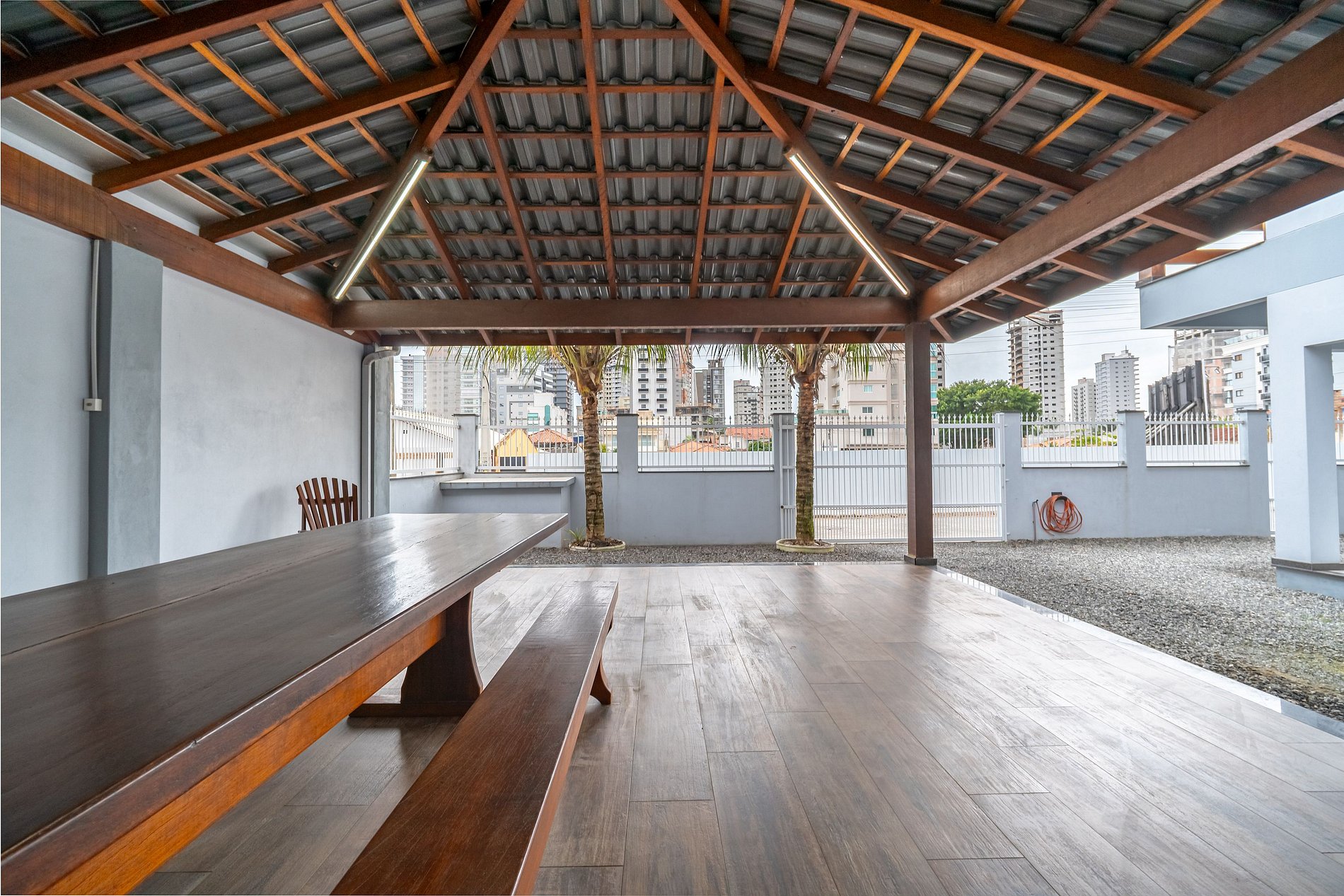 O destaque é a área gourmet externa: ampla, perfeita para almoços, celebrações ou simplesmente curtir a preguiça da tarde. Possui mesa, churrasqueira, pia e banheiro completo.