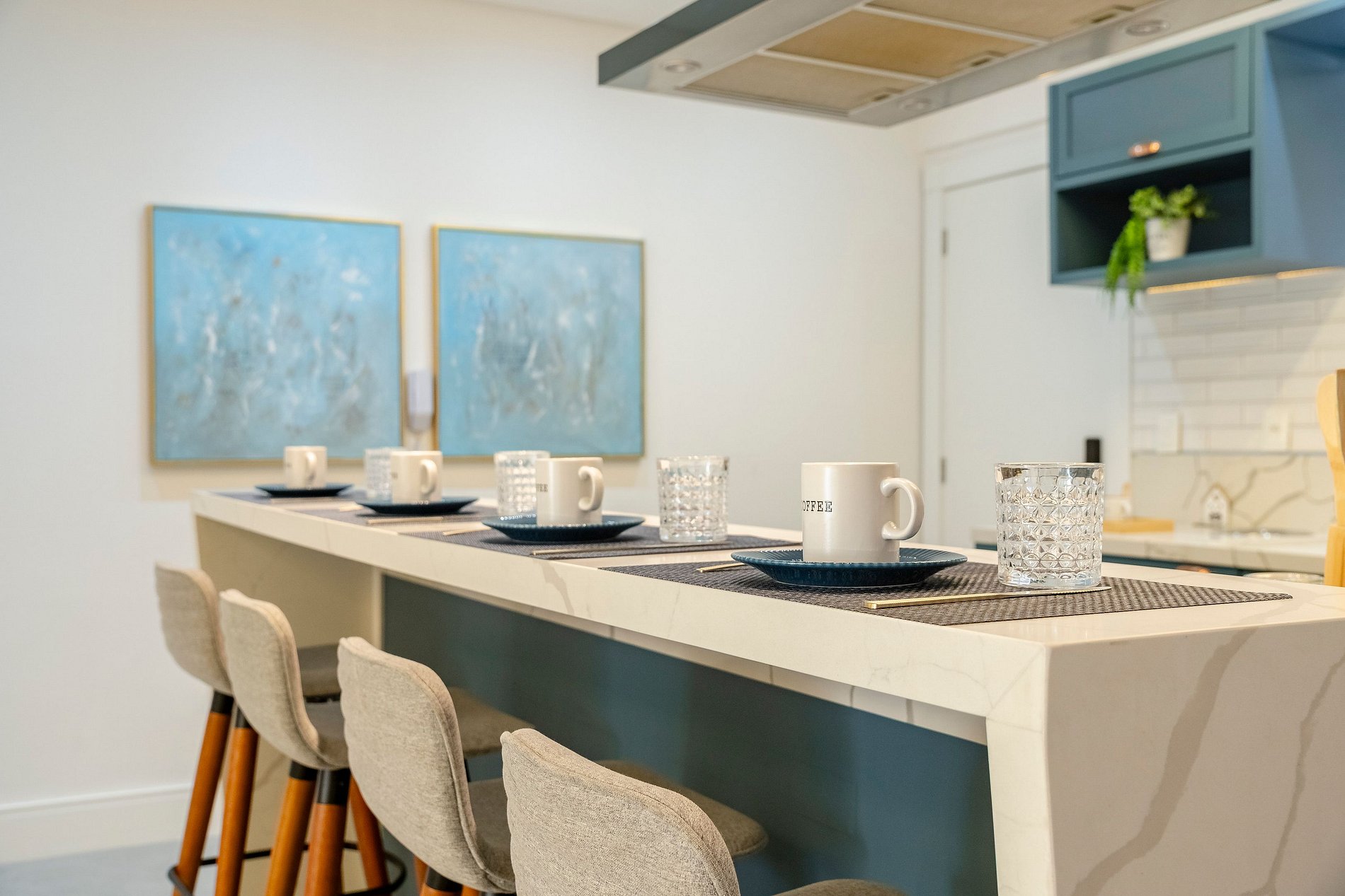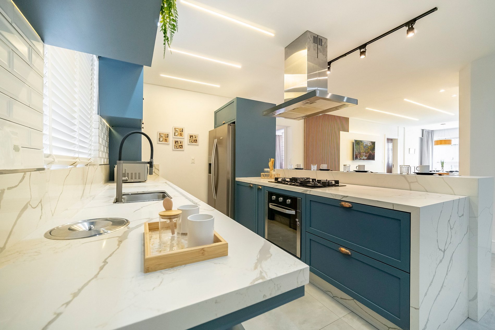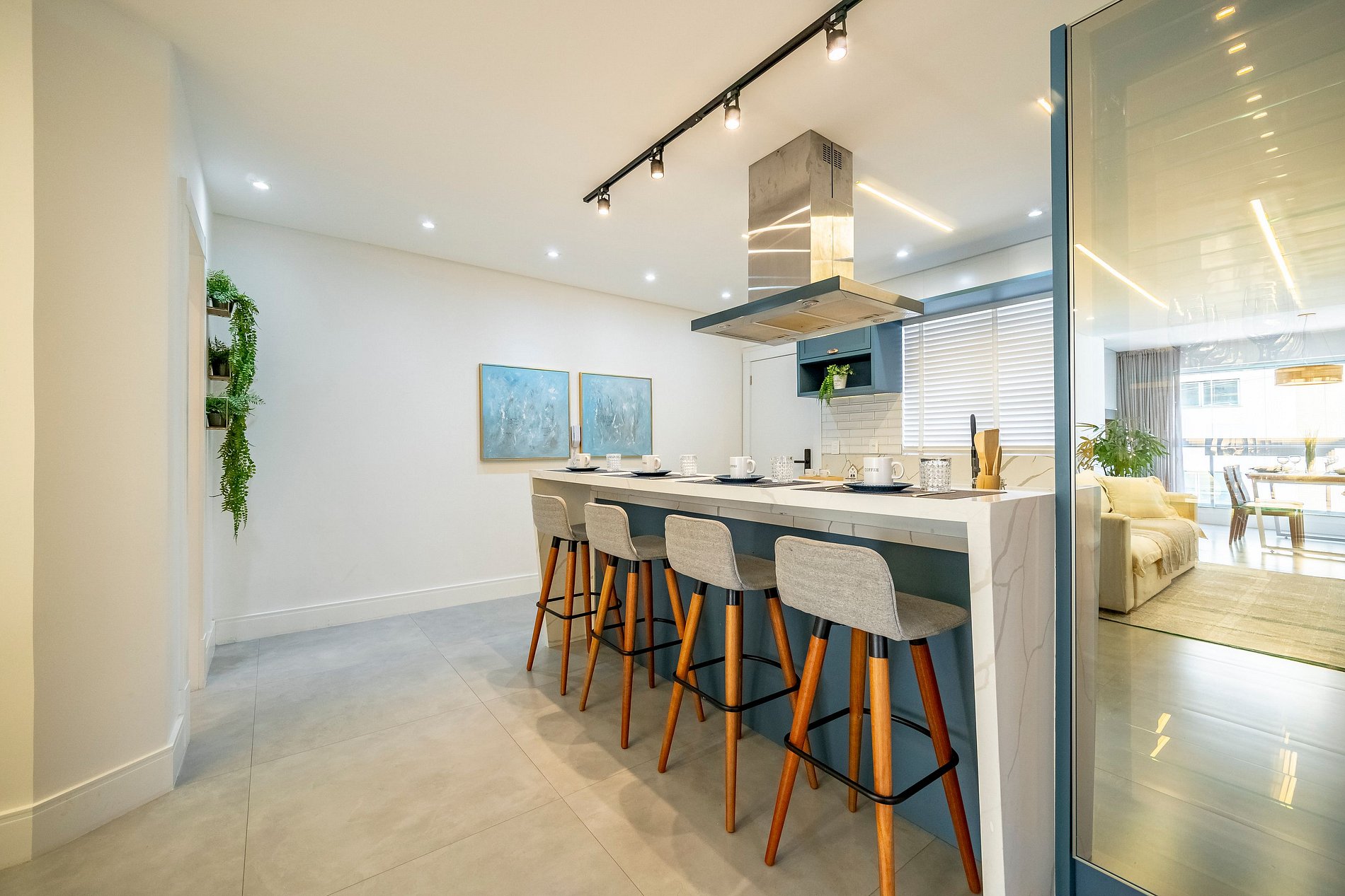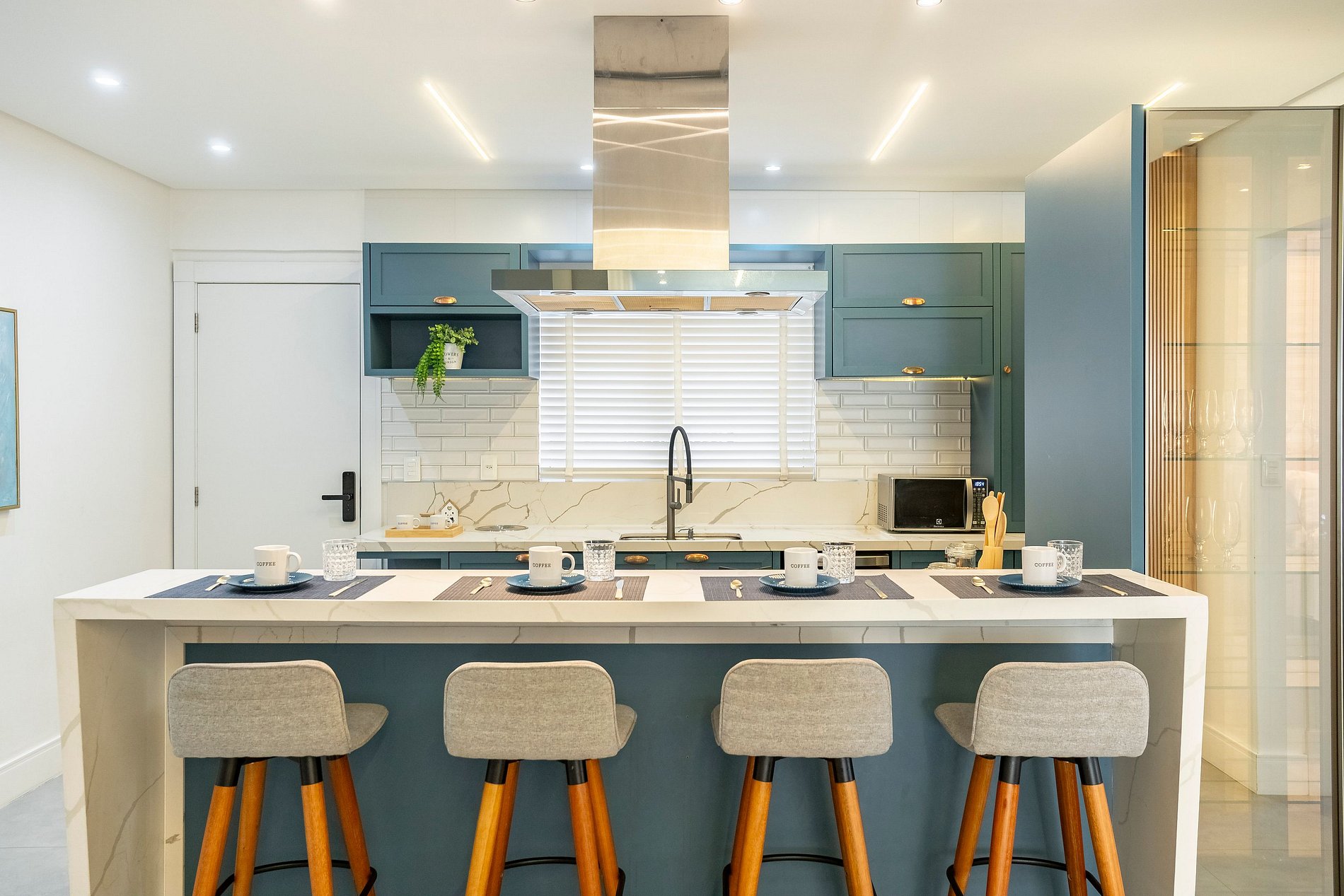 Ao entrar, a iluminação suave da cozinha já dá o tom do ambiente: um espaço moderno, super equipado e pensado para quem aprecia praticidade sem abrir mão de estilo. A ampla bancada com quatro banquetas convida para cafés demorados, conversas com amigos e momentos descontraídos enquanto a lava-louças e a lava e seca facilitam totalmente a rotina.