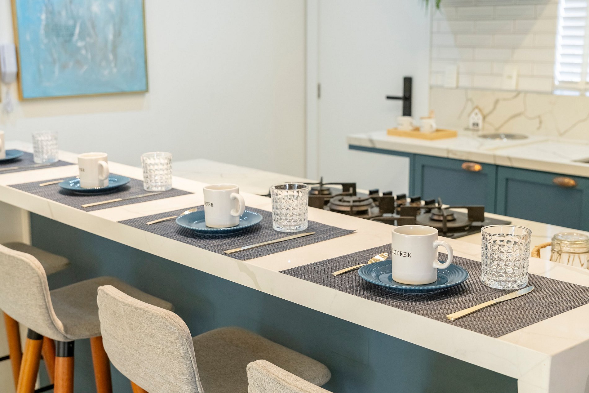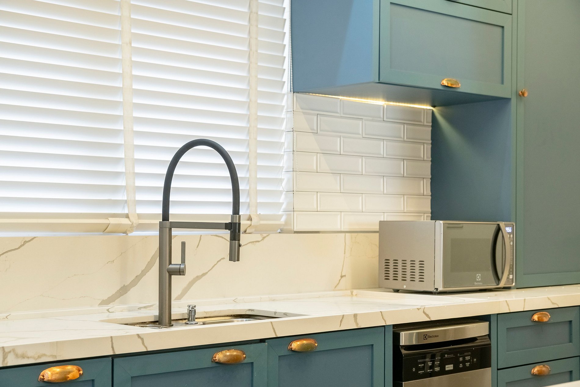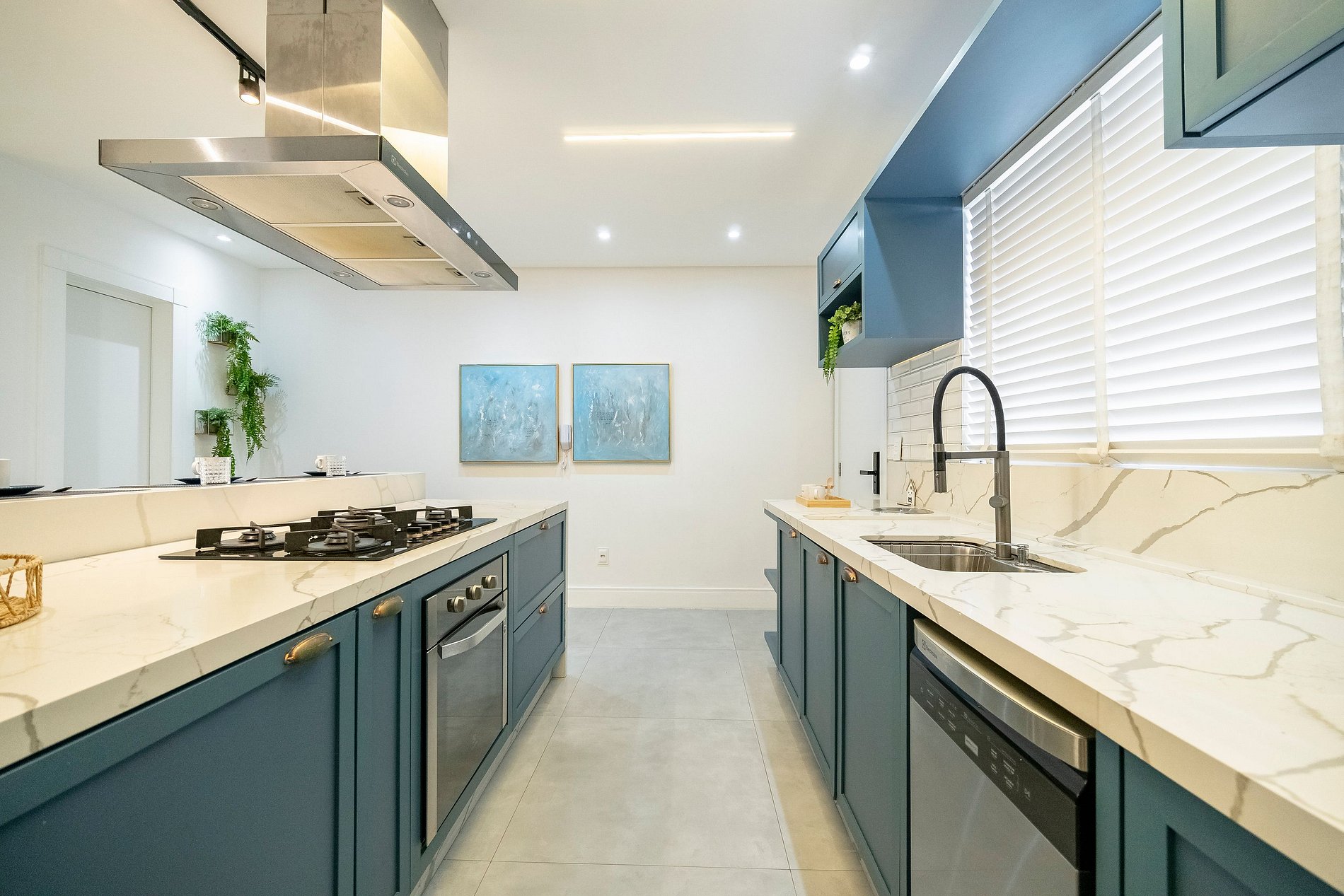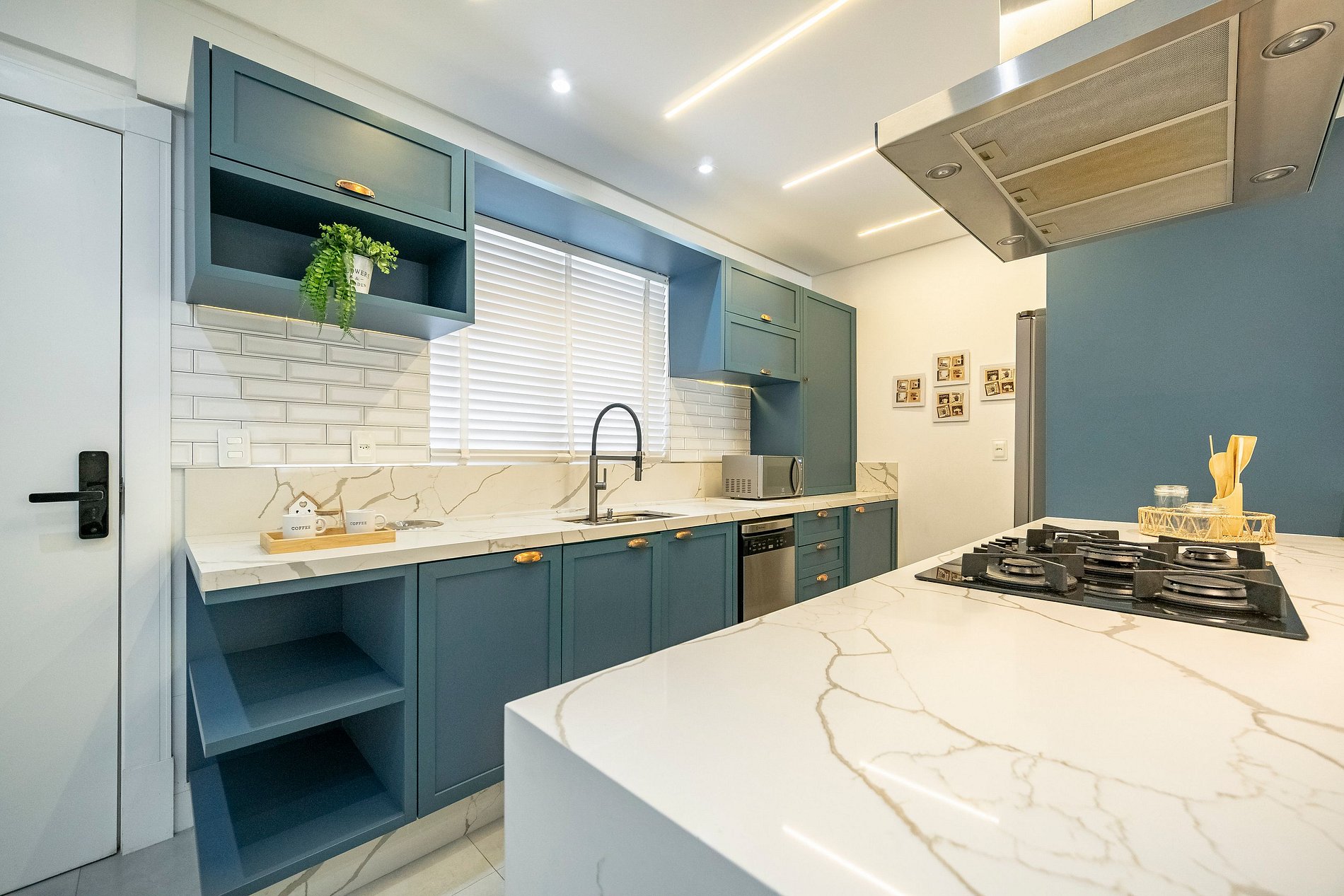 Ao entrar, a iluminação suave da cozinha já dá o tom do ambiente: um espaço moderno, super equipado e pensado para quem aprecia praticidade sem abrir mão de estilo. A ampla bancada com quatro banquetas convida para cafés demorados, conversas com amigos e momentos descontraídos enquanto a lava-louças e a lava e seca facilitam totalmente a rotina.