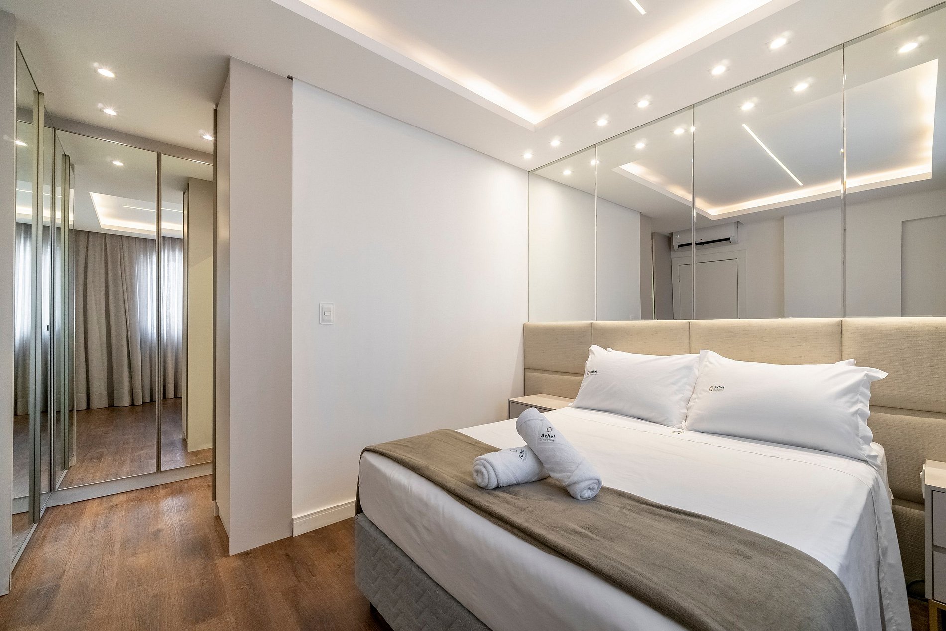 O apartamento possui uma suíte, e outra demi-suíte, ambas impecáveis, todas climatizadas e decoradas com muito bom gosto. Com camas de casal, guarda-roupas amplos e banheiros modernos, cada detalhe foi pensado para proporcionar conforto e privacidade, o tipo de ambiente onde o hóspede realmente se sente acolhido.