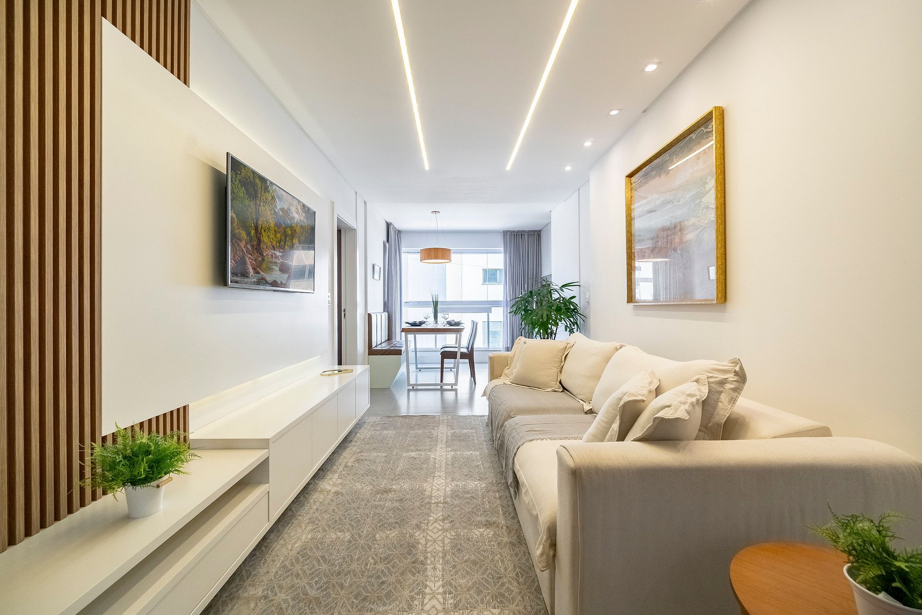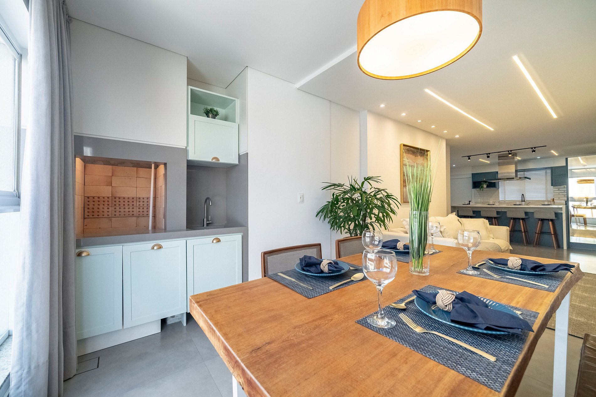 A sala de estar, ampla e sofisticada, conta com uma Smart TV perfeita para momentos de descanso. Integrada ao ambiente, a área da churrasqueira oferece mesa para quatro pessoas, criando um espaço charmoso para refeições especiais ou para aquele happy hour no fim do dia.