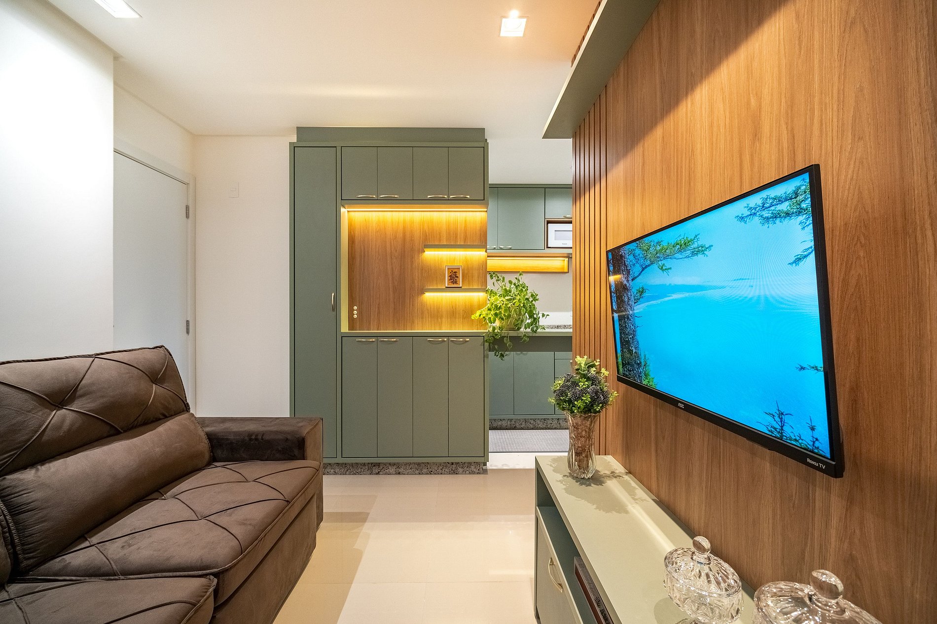 - Sala de Estar: sofá, Smart TV e ar condicionado.