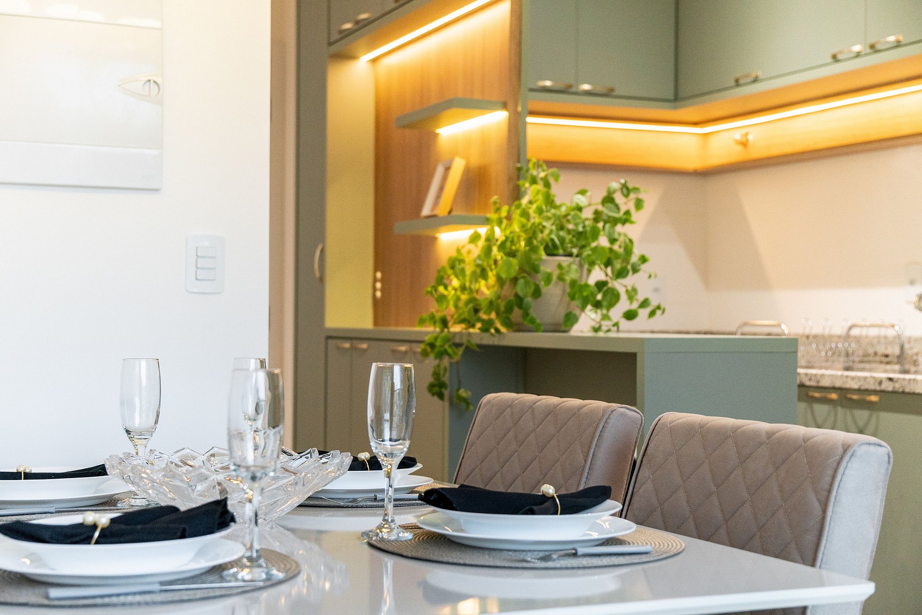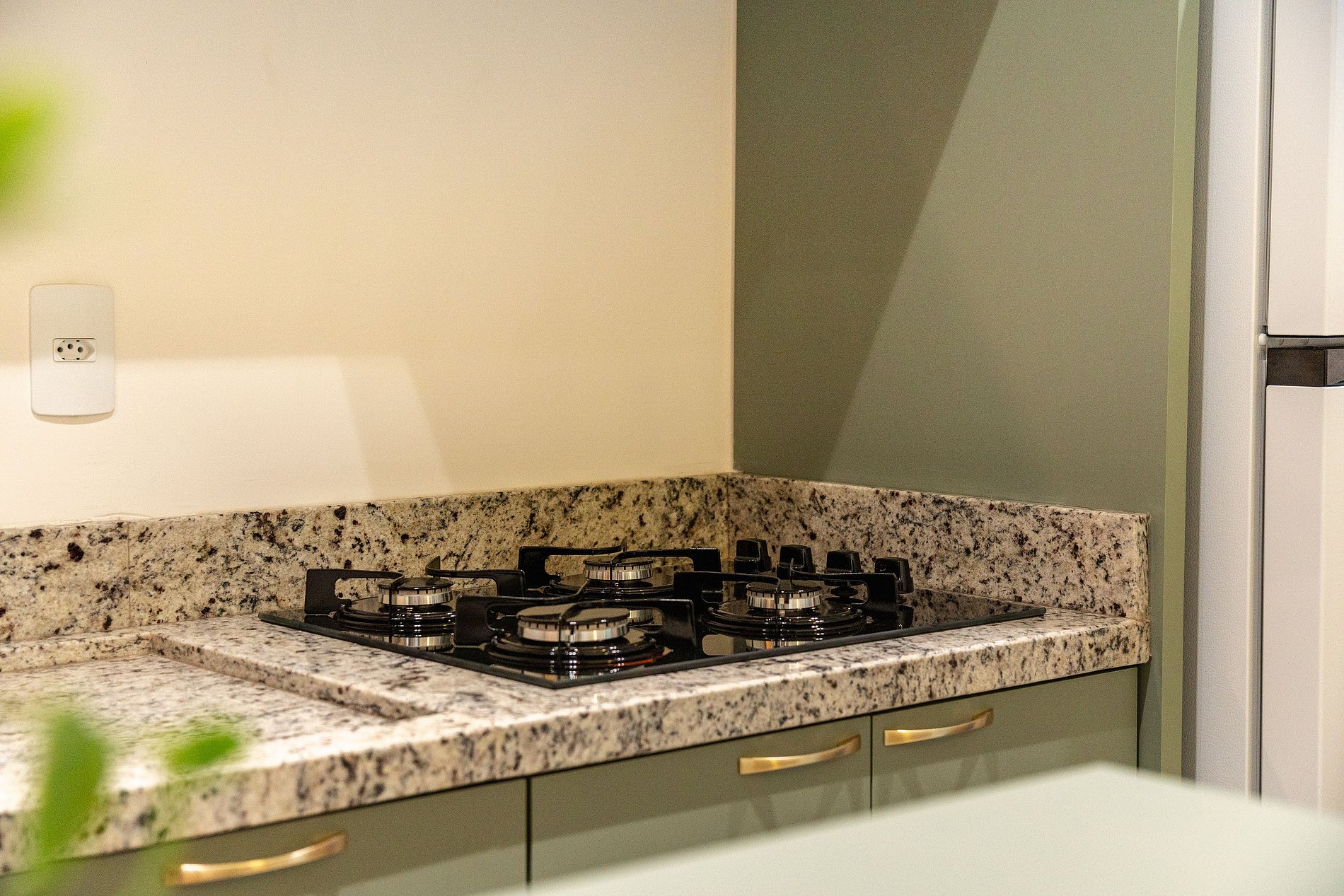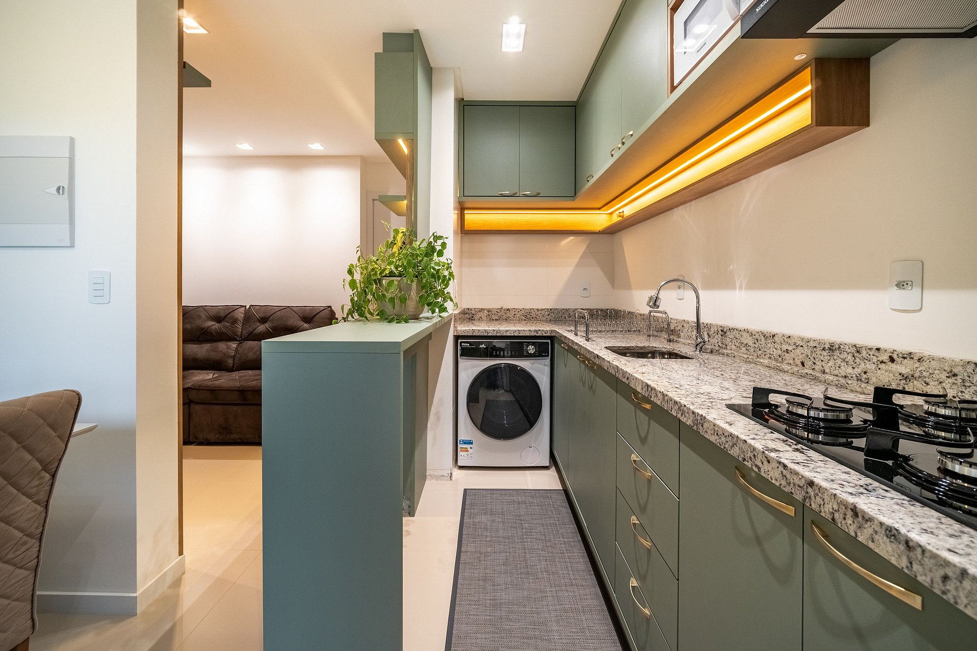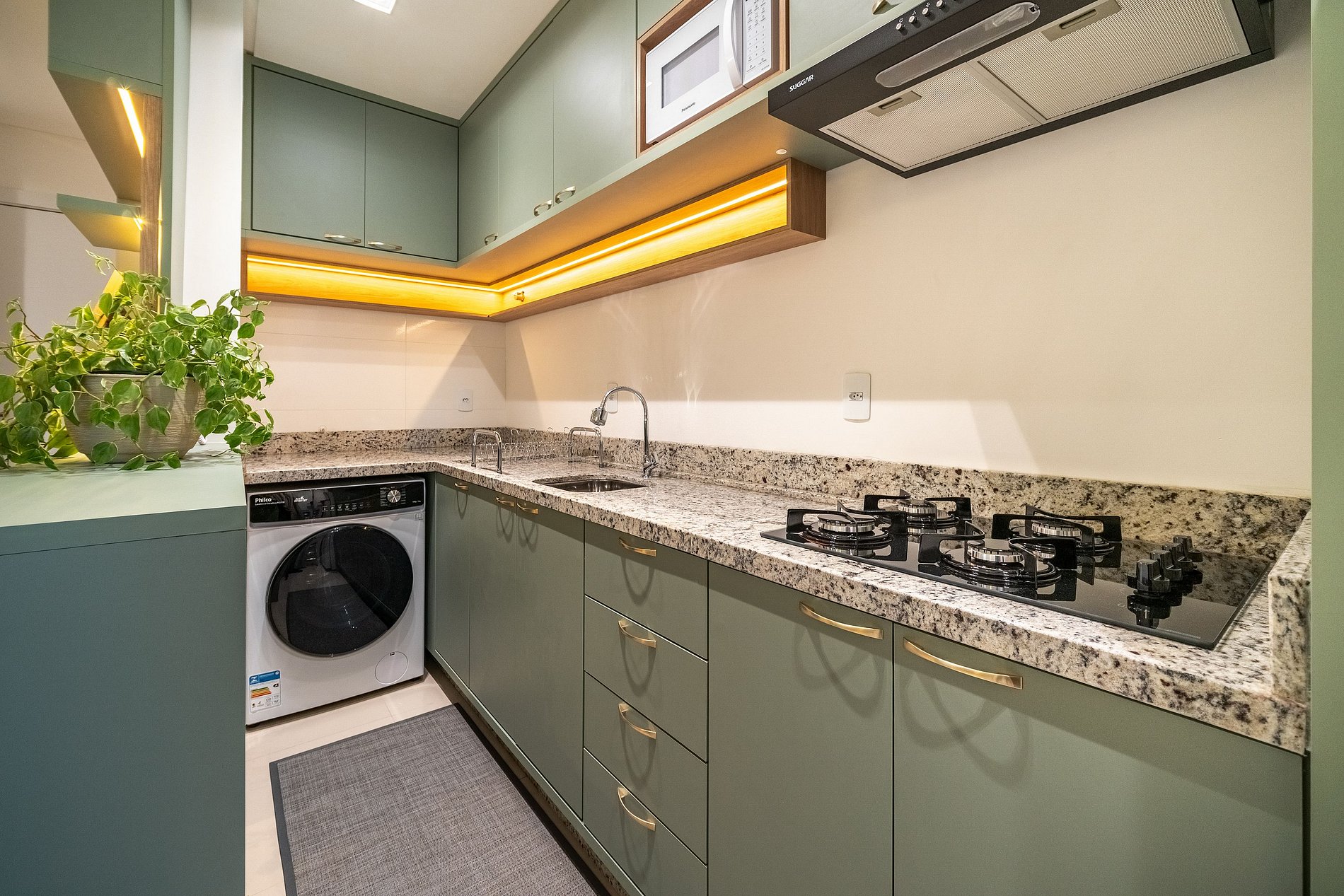 - Cozinha: geladeira, microondas, fogão, depurador, máquina de lavar e utensílios.